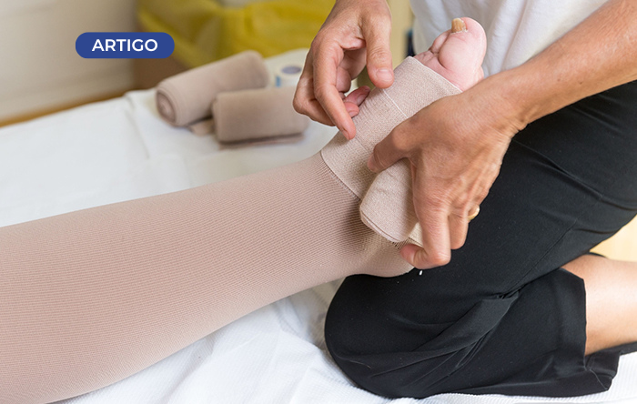 Uso de meias ou bandagens compressivas para melhorar a circulação sanguínea nas pernas, auxiliando no tratamento de varizes e na prevenção de complicações como inchaço ou úlceras.